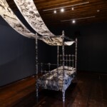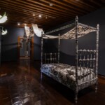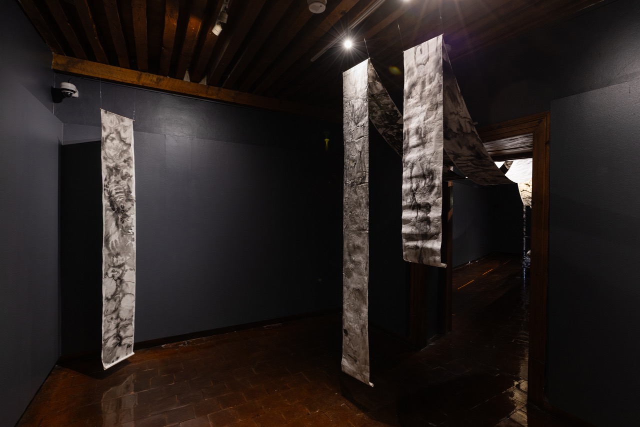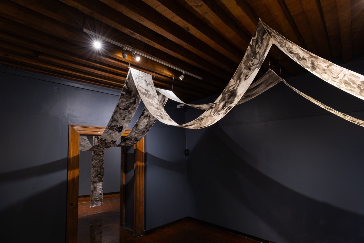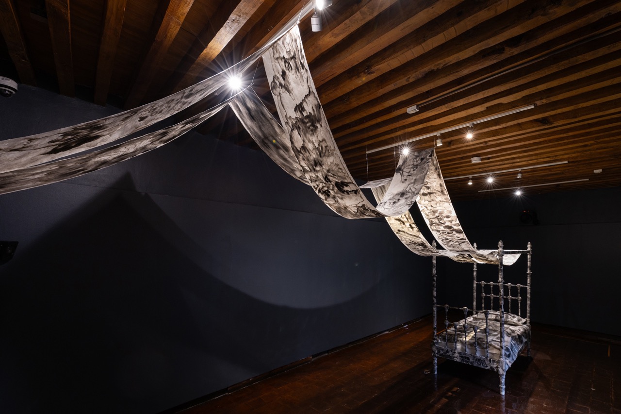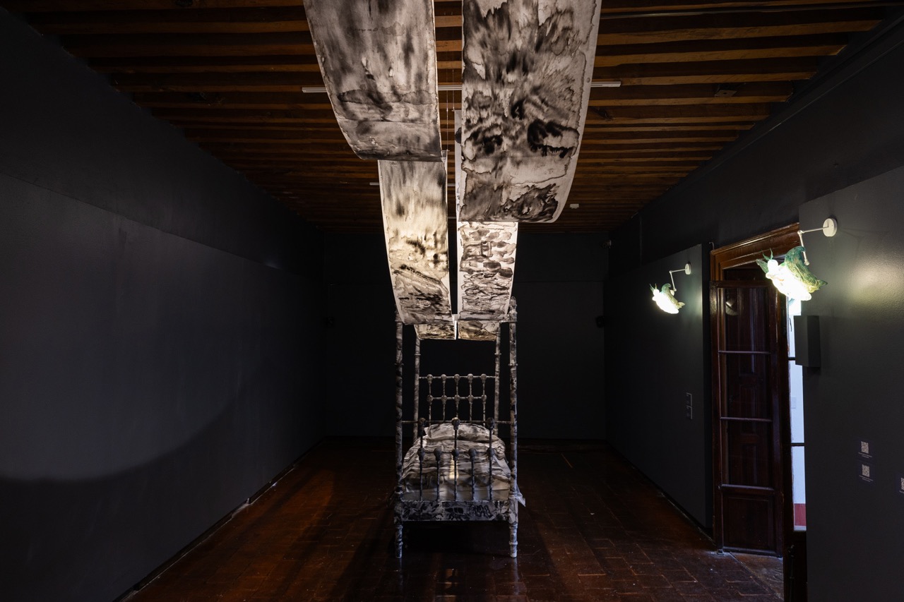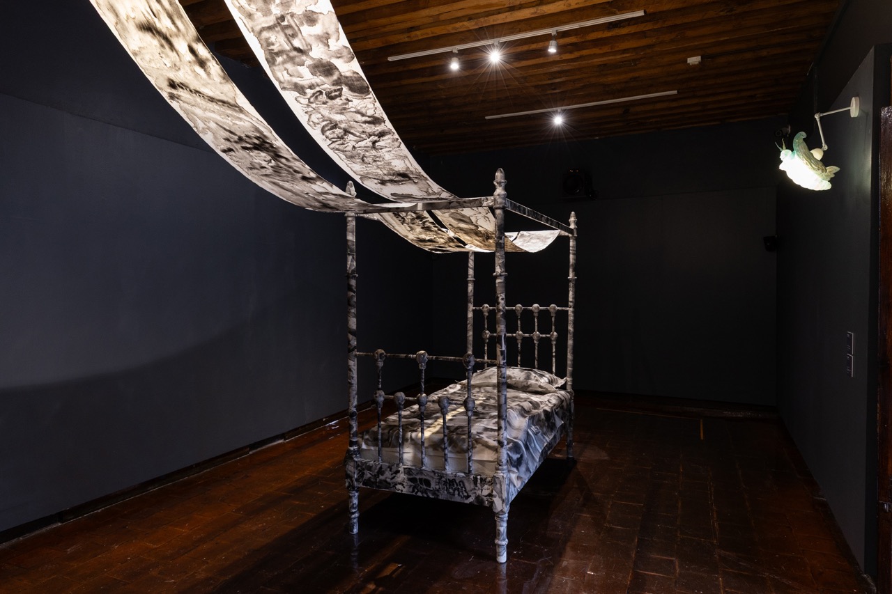 En sala, la obra se despliega como un recorrido sensorial: mariposas nocturnas suspendidas a modo de lámparas alumbran el tránsito hacia un territorio regido por los sueños. Allí nos recibe una cama recubierta de papel y dibujos en tinta, cuyas imágenes se prolongan hacia una segunda sala donde emerge un paisaje visual íntimo, difuso y fragmentario, como la memoria de un sueño que apenas se sostiene al despertar.