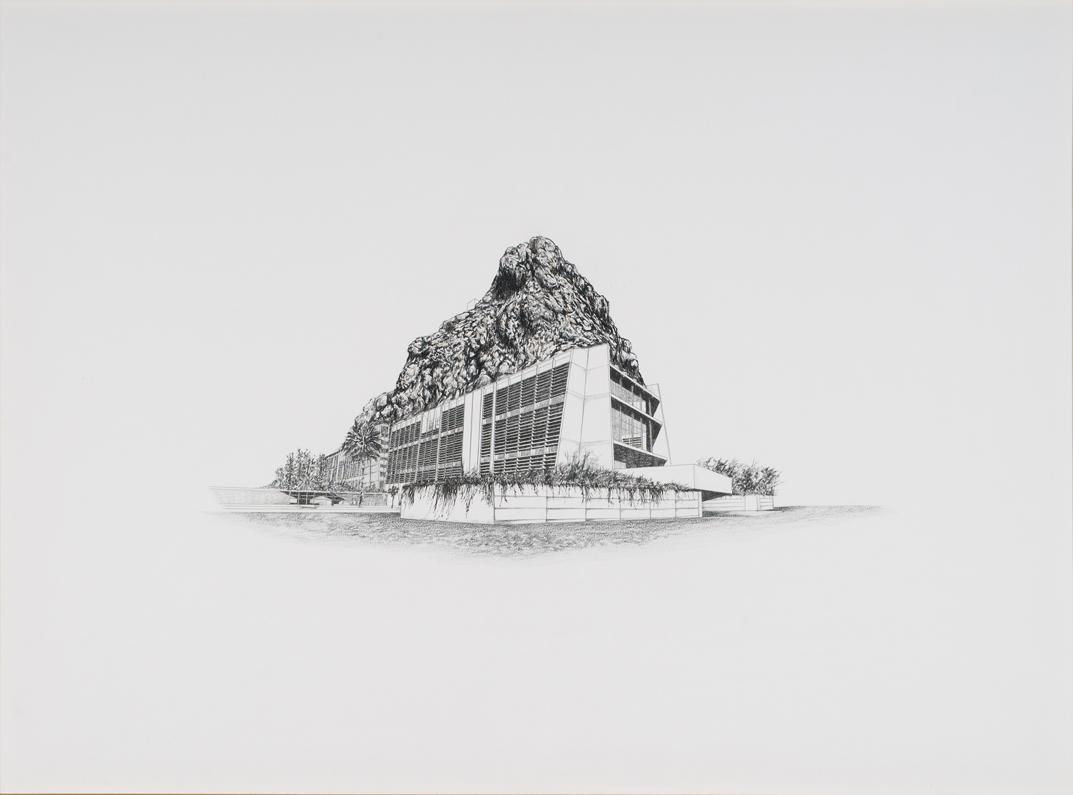 Uno de los intereses artísticos de Jorge Méndez Blake consiste en integrar a su trabajo la literatura como herramienta conceptual. Tanto la documentación histórica como la narración literaria le permiten establecer relaciones con el arte a través del lente de la creación plástica. Su dibujo de la ampliación a la Biblioteca Vasconcelos es una muestra de cómo se aproxima a las bibliotecas como espacios que unen lo literario, lo arquitectónico y lo geográfico.