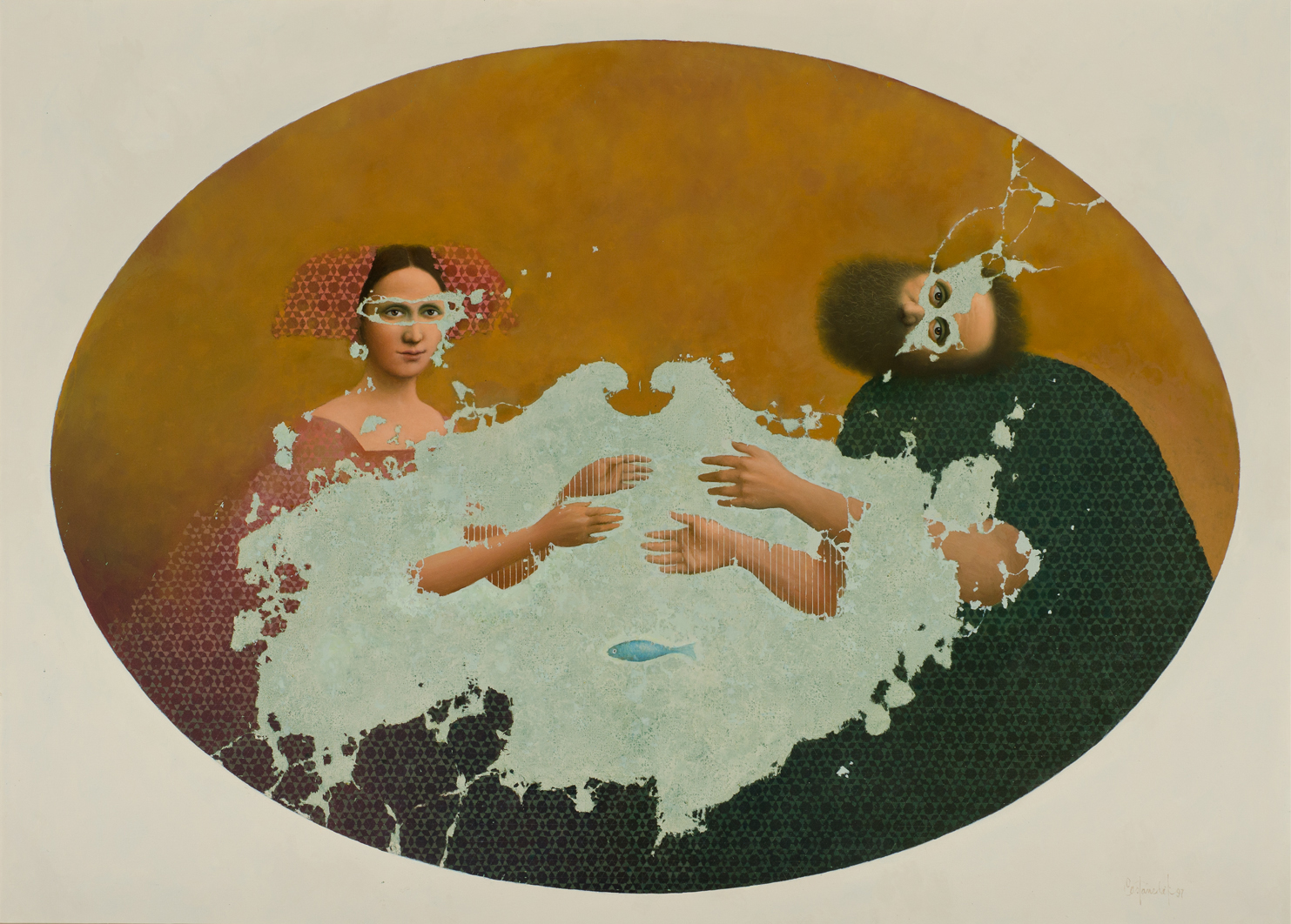 La afinidad de Alfredo Castañeda por el surrealismo es visible en esta pieza, donde dos personajes parecen hacer al espectador partícipe de un secreto que comparten. Tanto los gestos que realizan con sus manos como sus miradas fijas son atravesados por una mancha en la escena, con la distintiva intervención de un pez azul entre ambos personajes. Estos elementos, aunados a la manera en la que ambas figuras parecen fusionarse, auguran que la escena podría ser tanto un sueño como una memora difusa, al tiempo que se suman a la naturaleza enigmática de la pieza.