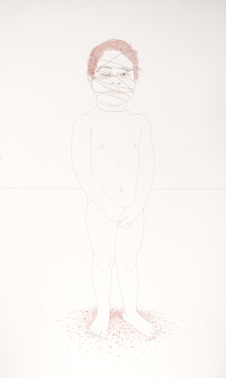 Esta pieza de Gabriel de la Mora desafía la concepción tradicional del dibujo como disciplina, explorando las posibilidades que emergen al utilizar materiales inusuales. Para la creación de Emiliano Morales de la Mora jugando…, realizó un retrato sin recurrir a los trazos de grafito o pintura, empleando en su lugar cabello humano y sintético sobre papel. Si bien el retrato de Emiliano presenta una figura que despierta preguntas, la técnica de la pieza no las responde, sino que desencadena más.