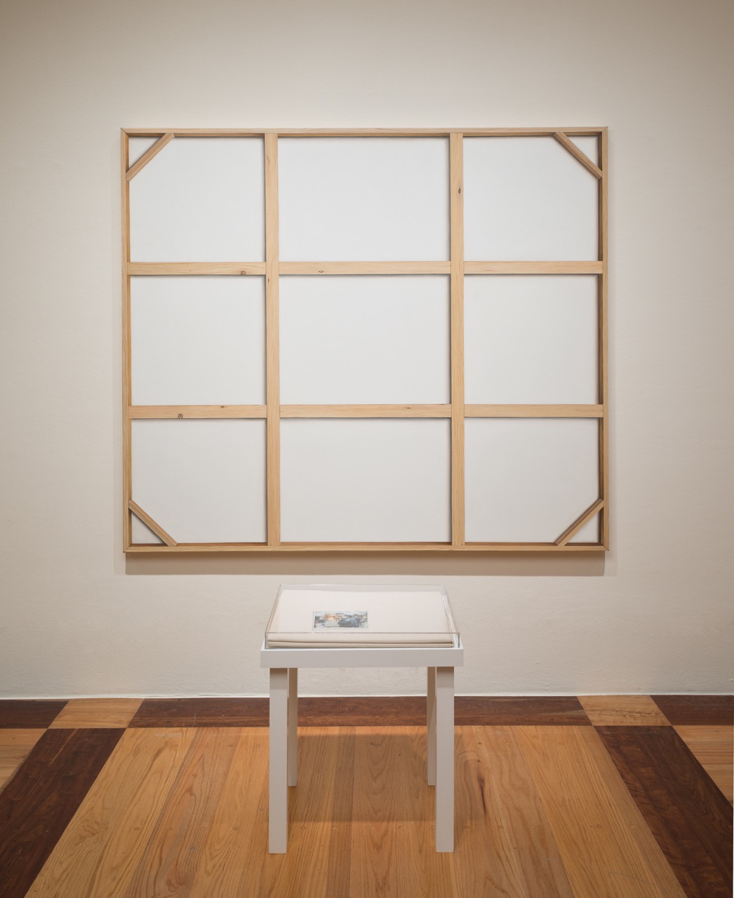 A primera vista, Estructura para un dilema II parece mostrar un bastidor montado al revés. Sin embargo, se trata de un lienzo meticulosamente pintado para crear esa ilusión. En su búsqueda por explorar el papel de la pintura en la escena actual del arte contemporáneo, Hugo Lugo coloca la pieza frente a una mesa sobre la cual se puede ver una imagen pequeña que representa la lucha de esta técnica milenaria dentro de los espacios expositivos.