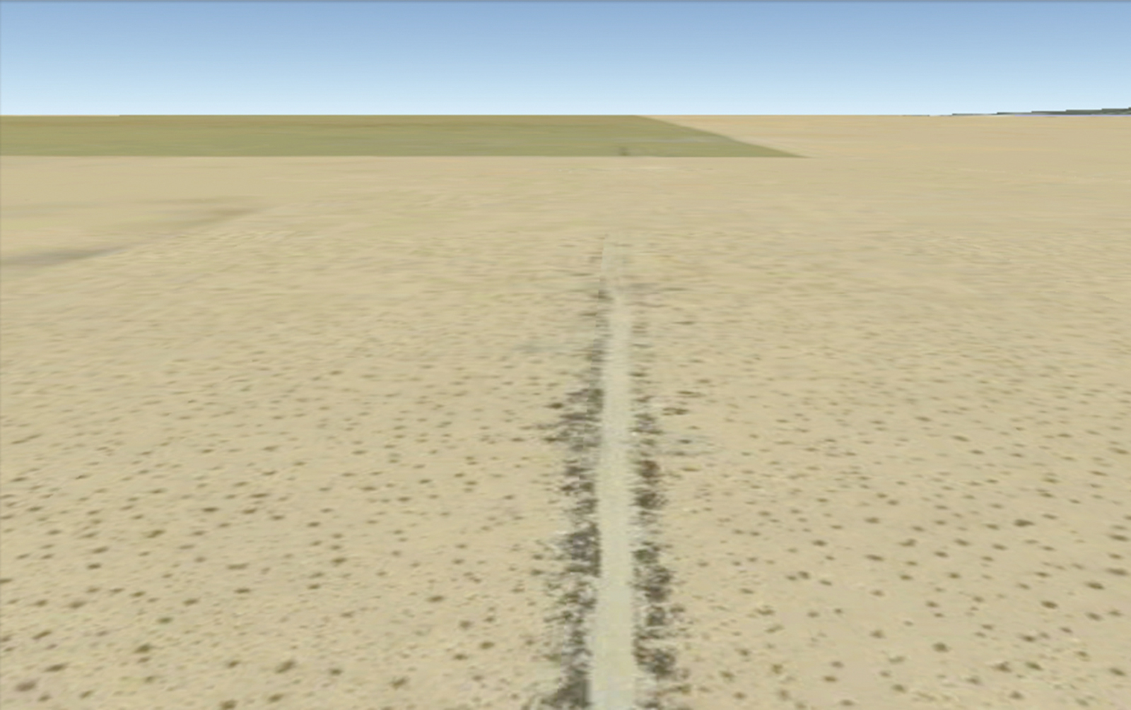 Fin del camino (2011) surge de una serie de recorridos virtuales por el desierto fronterizo de Sonora para rastrear caminos que terminan abruptamente. La textura pixeleada de la imagen satelital y el hallazgo de caminos de uso indeterminado, genera un umbral que invita a pensar la actividad humana en un territorio en permanente disputa