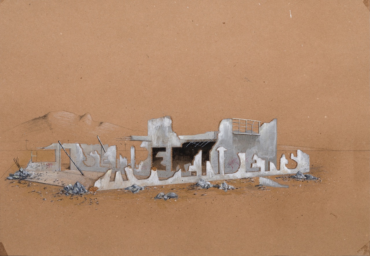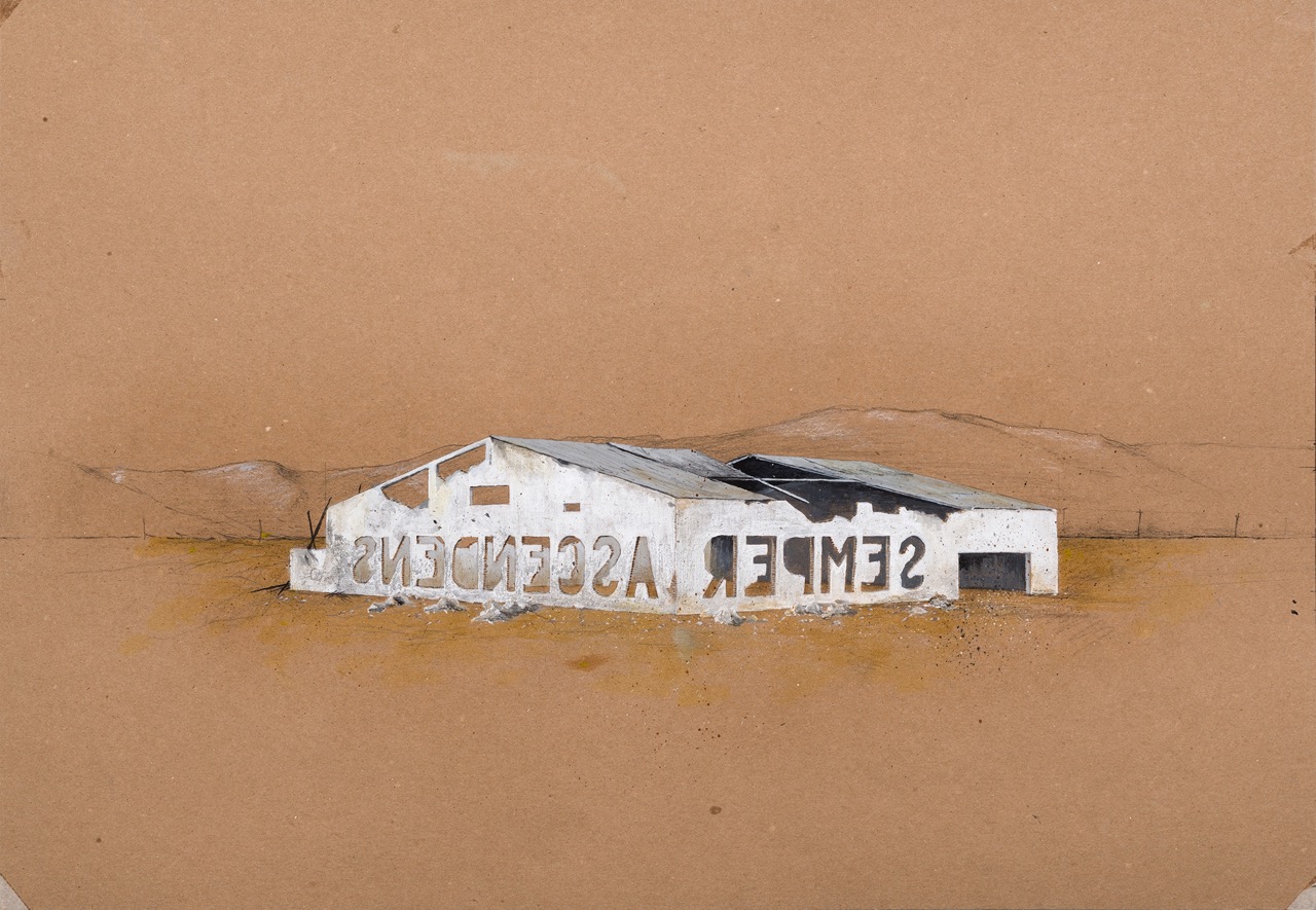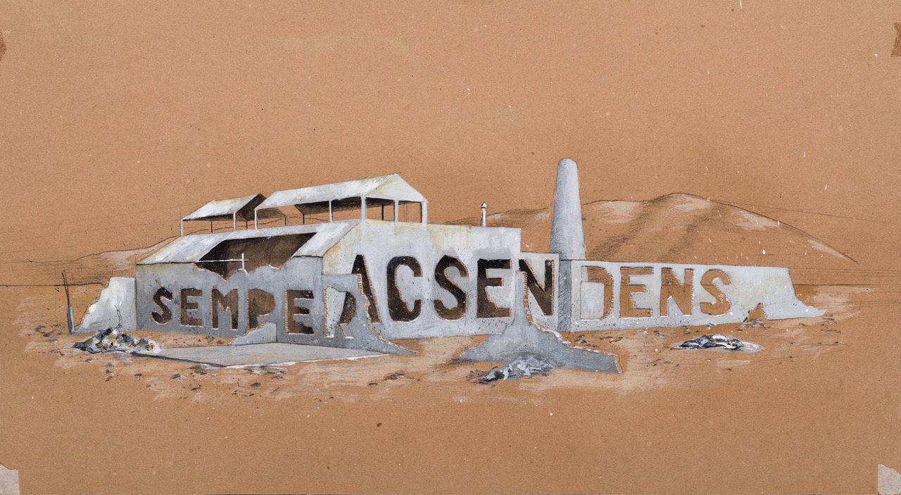 Además de ser el título de la pieza, la frase Semper Ascendens (“siempre ascendiendo” en latín) forma parte del escudo de armas del estado de Nuevo León. Dispuesta en tres ilustraciones sobre cartulina, su enunciación explora el legado industrial de la región en diferentes espacios, detonando una reflexión sobre la relación de las comunidades con los territorios marcados por el desarrollo industrial.