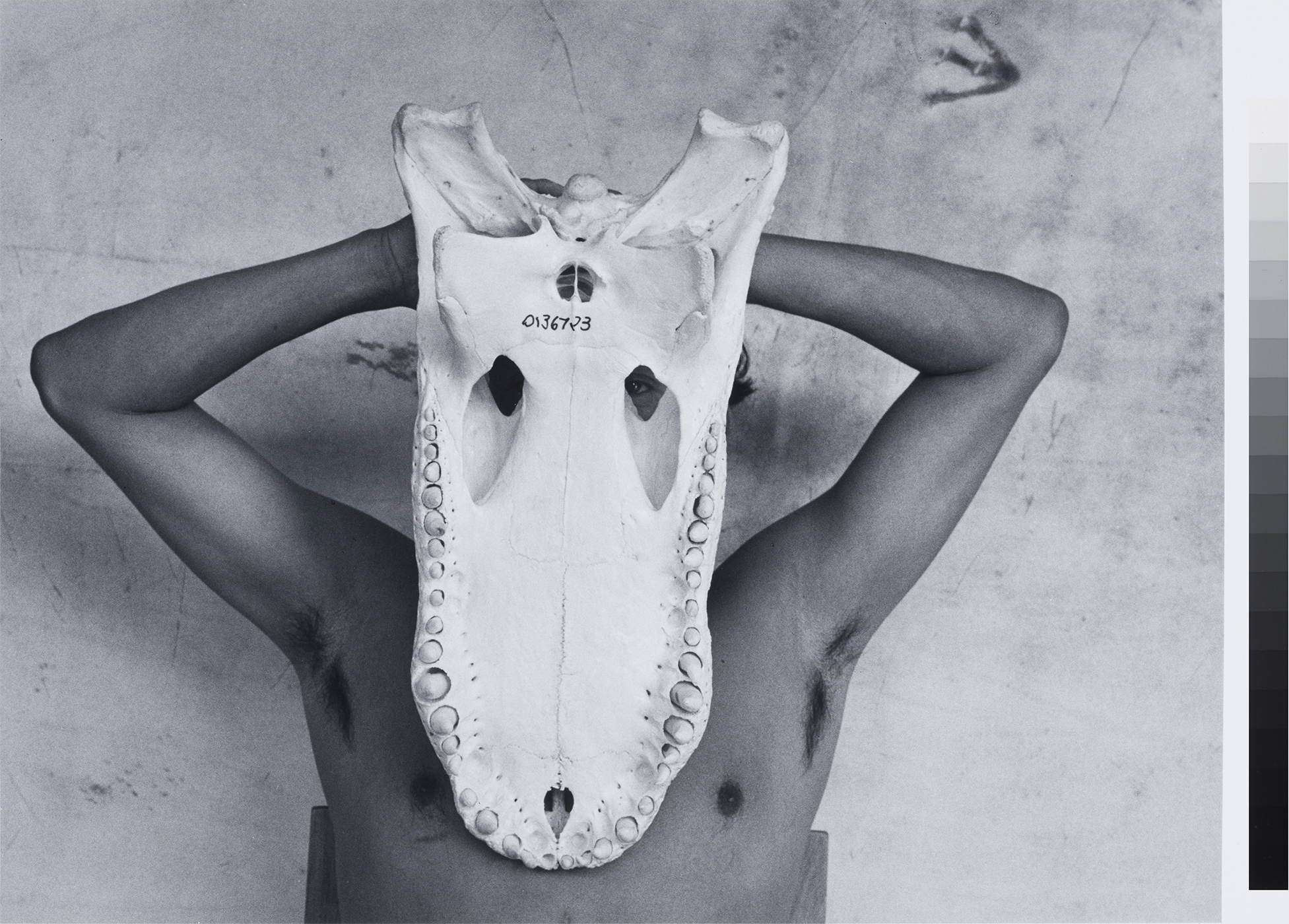 En línea con su producción fotográfica, Flor Garduño retrató al pintor oaxaqueño Sergio Hernández destacando un elemento representativo del artista. Por medio del cráneo de un animal como máscara, se hace alusión a la relación del artista con el misticismo y el imaginario de culturas populares e indígenas oaxaqueñas, así como su influencia en la producción artística del pintor. A su vez, la máscara aborda la teatralidad y metamorfosis que intervienen en la construcción de identidades y cómo se traducen en el retrato.